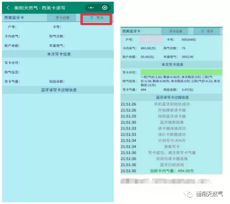 5、充值成功后將燃?xì)饪ㄐ酒虏迦胨{牙讀卡器中,點擊寫卡可將儲存余額轉(zhuǎn)充成氣量。(如顯示寫卡不成功,可再次點擊寫卡重試,轉(zhuǎn)氣時不能關(guān)閉藍牙。)